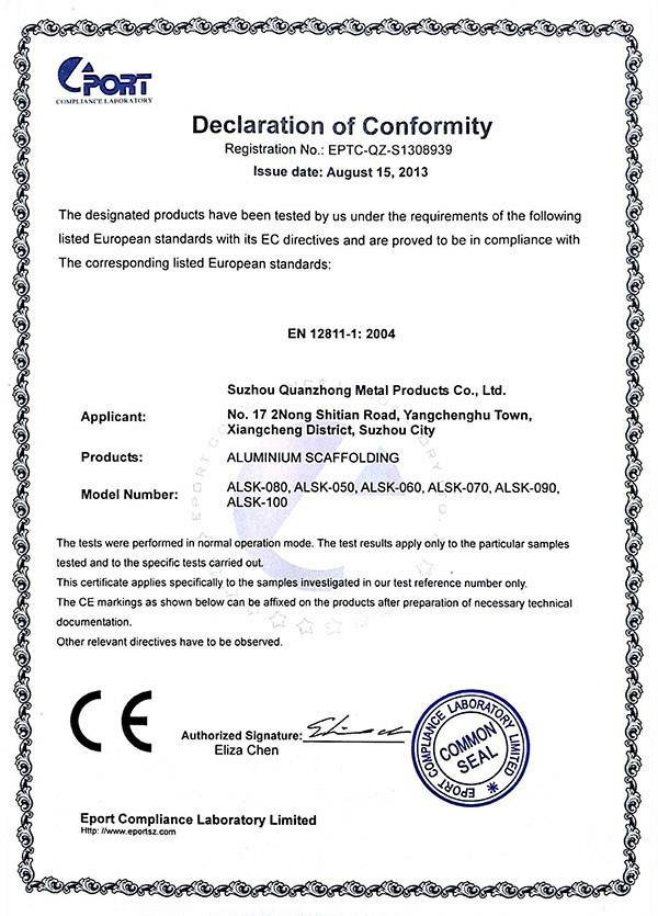 星空体育-星空(中国)一站式服务平台专注铝合金制品的开发“产品就是人品”的企业理念,不断进行技术创新、设备创新、服务创新、和管理方式创新来继续研发出更多满足未来发展需要的产品, 公司产品通过欧盟认证取得CE认证并取得证书,铝合金脚手架系列产品通过SGS认证,铝合金平台和梯具类产品均严格按照GB12142-2007,GB17888等标准设计生产。